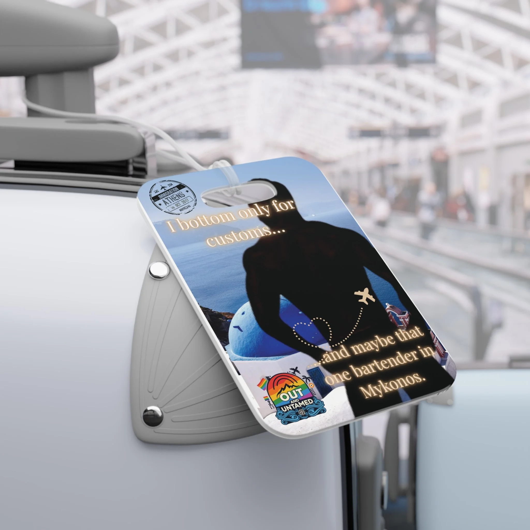 Add a splash of sass (and just a hint of scandal) to your suitcase with this bold, booty-forward luggage tag. Crafted from durable, glossy plastic, it’s made to survive airport chaos, vacation hookups, and that one suspicious glance from the customs agent. Featuring a flirty silhouette and our infamous quote — “I bottom only for customs… and maybe that one bartender in Mykonos” — this tag is the perfect travel companion for those who fly loud, live proud, and never check their personality at the gate.